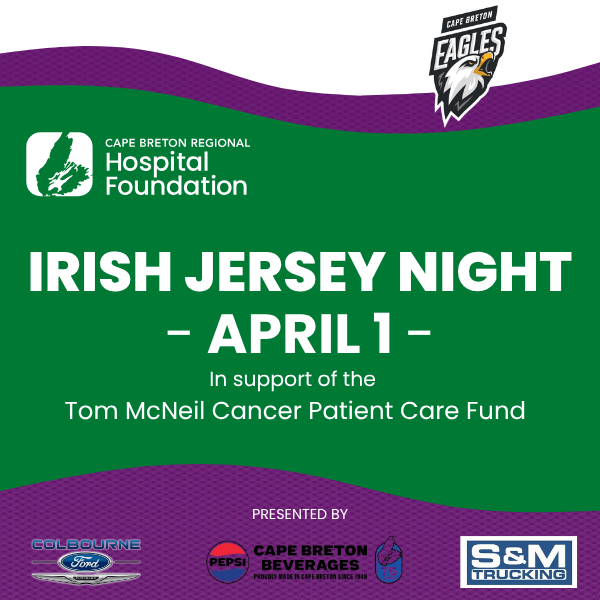 Join us at Centre 200 on Wednesday, April 1, as we celebrate the Cape Breton Eagles Irish Jersey Night in support of the Tom McNeil Cancer Patient Care Fund. The Eagles will take on the Newfoundland Regiment for the first round of playoffs, and raffle tickets will be sold for the chance to WIN one of the special game-worn “Irish” jerseys!